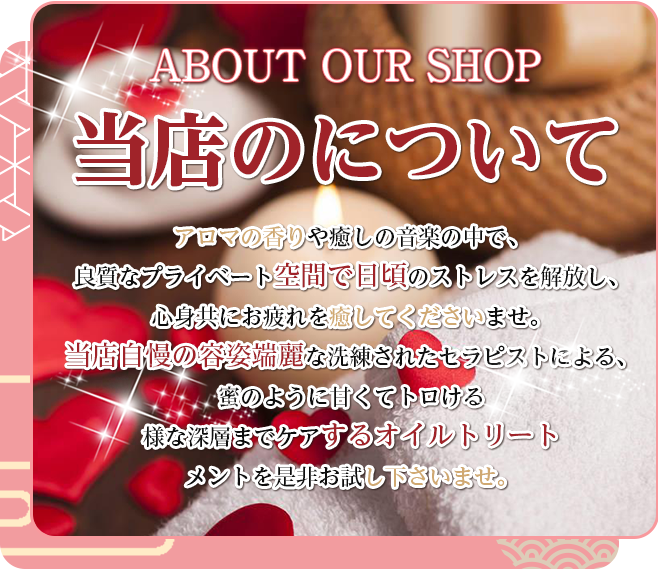 当店は、満足頂ける施術と雰囲気でお客様にご納得頂けるお店作りを心掛けています。あなただけの自分らしさを大切に出来る場所、毎日起きるいろんな出来事で、もしも自分らしさを見失ってもいつでも自分らしく温かい気持ちに戻れる場所。お疲れの際には是非お気軽に当店へお越しください。皆様のお越しを心よりお待ちしております。