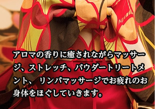 上質のアロマオイルを使用し、全身のパーツをひとつひとつ丁寧に時間をかけ、力強く且つお客様がリラックスできるストロークが特徴です。「気持ちよさ」を追及したマッサージは、いつの間にか寝ているお客様がほとんどです。その体験は時間の感覚がなくなってしまうほど。非日常の空間で極上のリラクゼーションをご堪能ください。